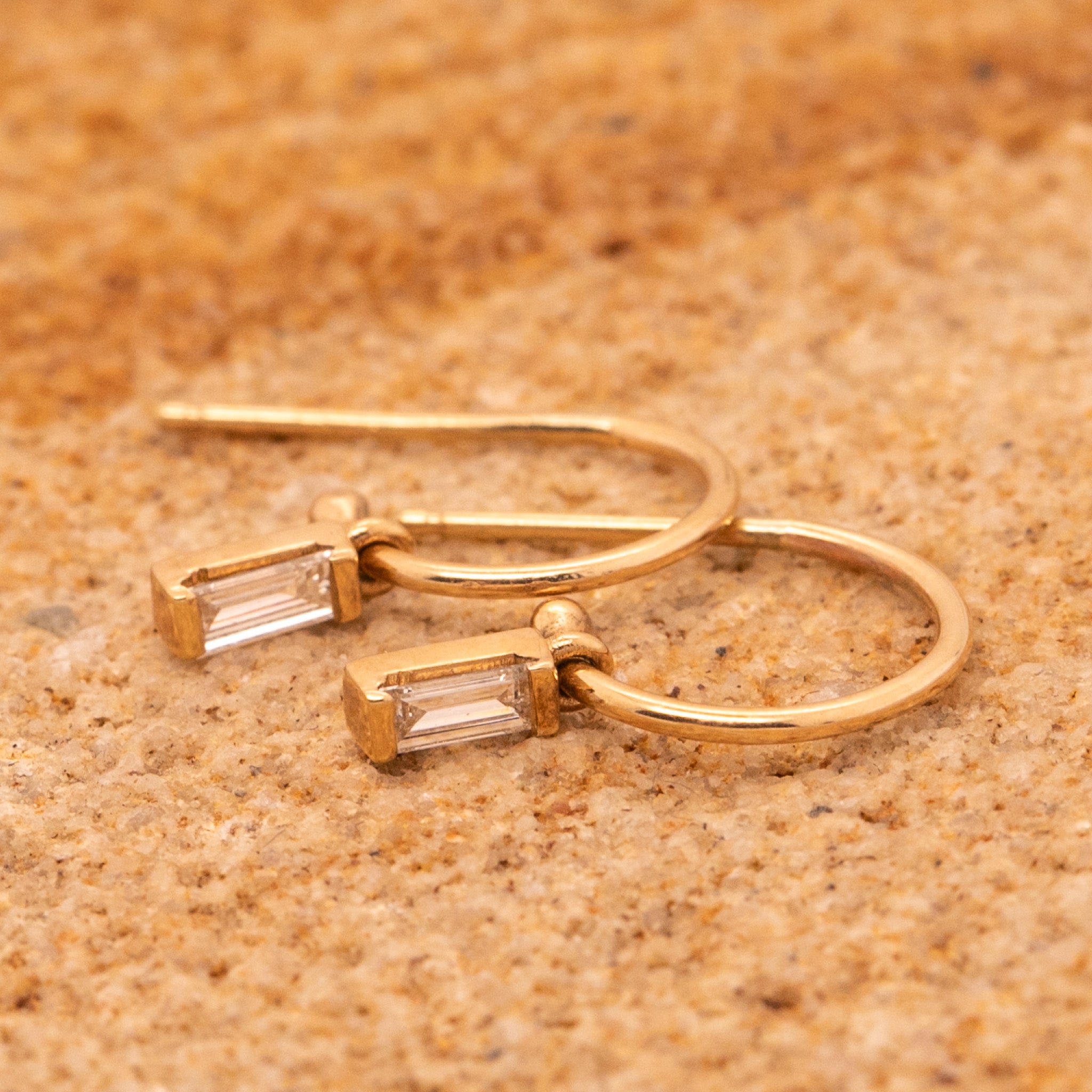 A modern classic with a touch of timeless sparkle, these 9ct Yellow Gold sleeper hoops feature elegant baguette-cut diamond drops that add just the right amount of sophistication. The clean geometric lines of the diamonds contrast beautifully with the warm glow of polished gold, creating a refined yet versatile look.